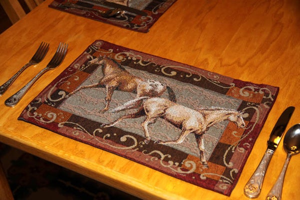 45 cm x 30cm katoen jacquard placemats met prachtige licenties uit JQ Licensing. De paarden set bevat 2 elk van 2 verschillende Whitetail paard designs. Materiaal is 65% Polyester / 35% katoen.