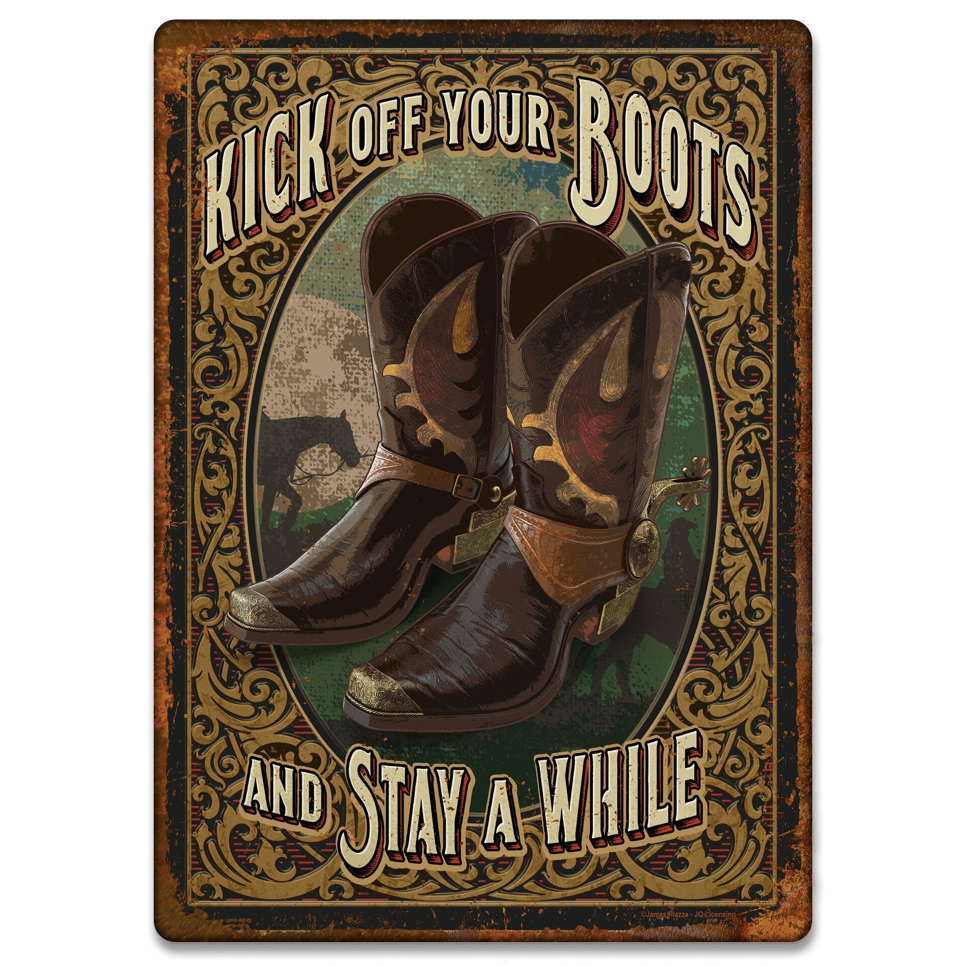 Schop die laarzen uit! Dit metalen tinnen bord is de ideale wanddecoratie voor elke westernliefhebber. Op dit bord staat de tekst 'Kick off your boots and stay a while'. Het kunstwerk kenmerkt een paar cowboylaarzen op de achtergrond.
