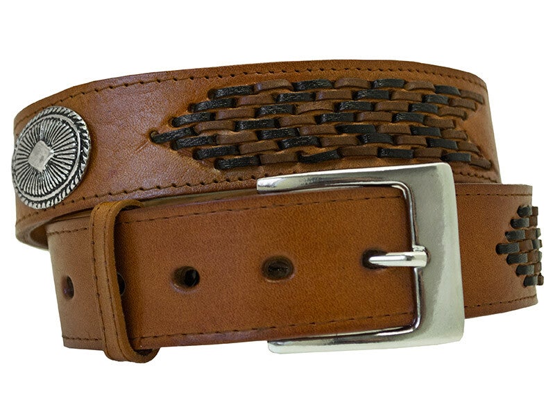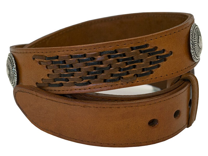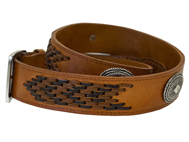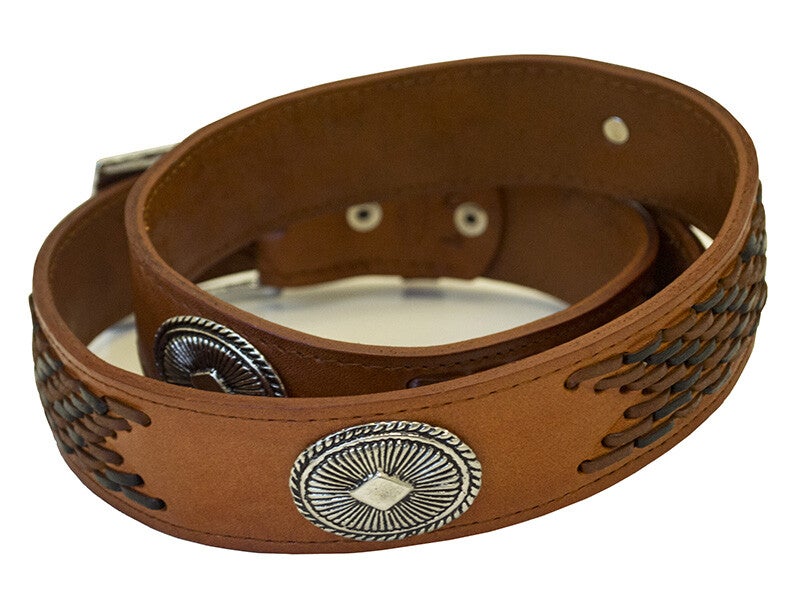 Stoere lederen riem geweven met Conchos, de gesp kan verwijderd worden om eem buckle te plaatsen.